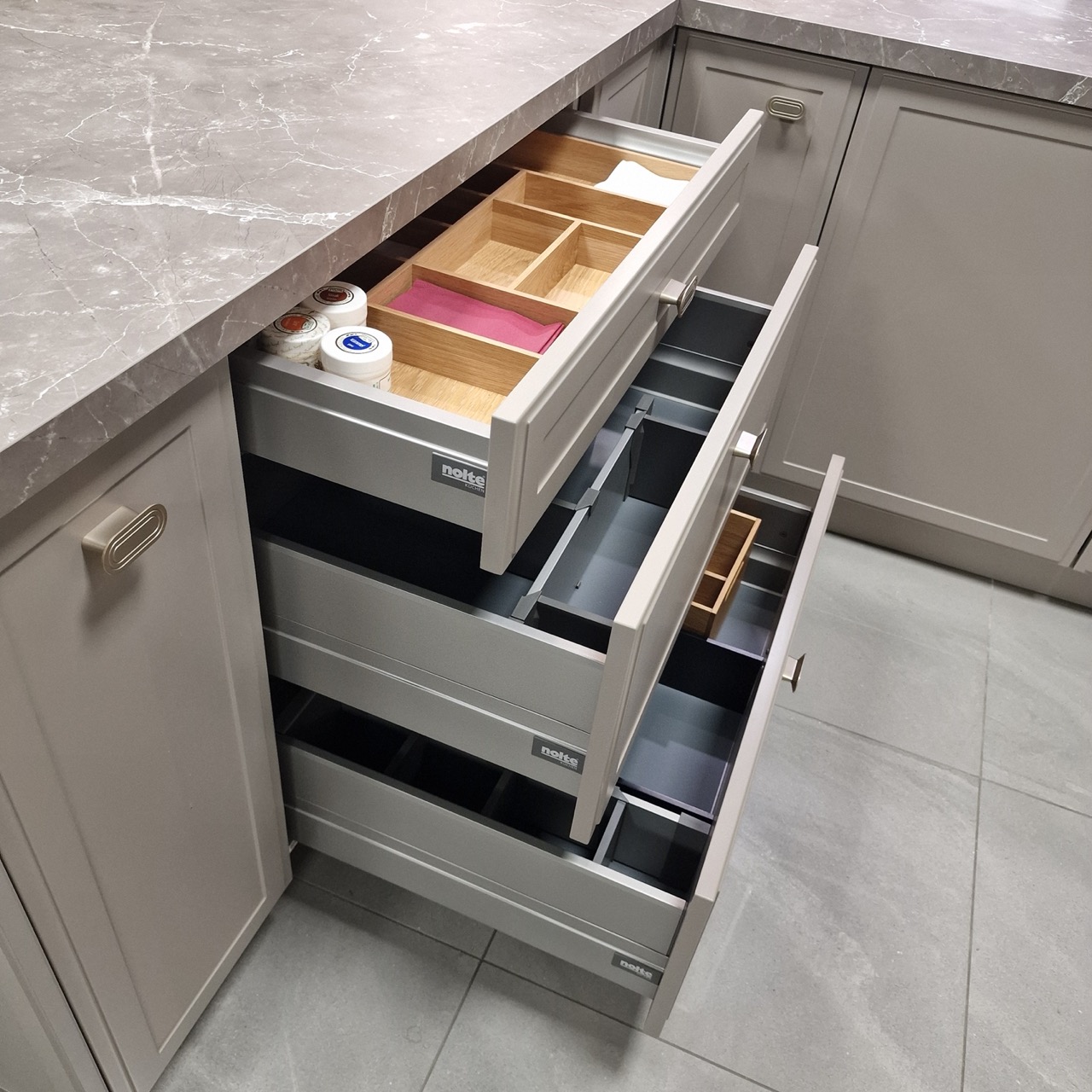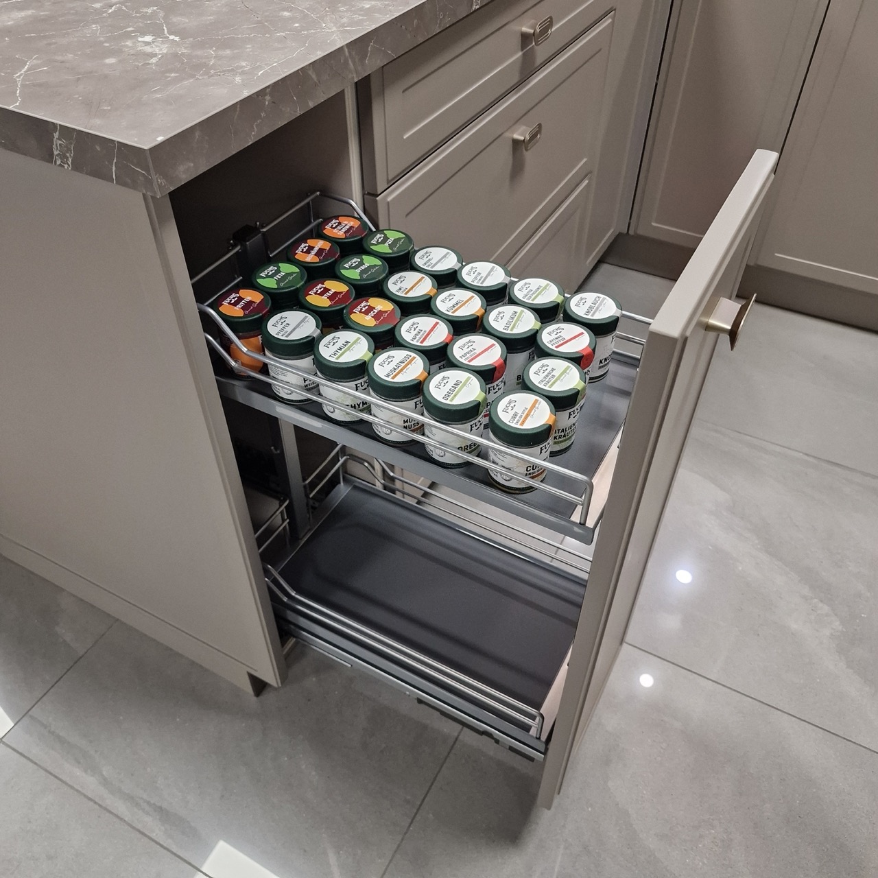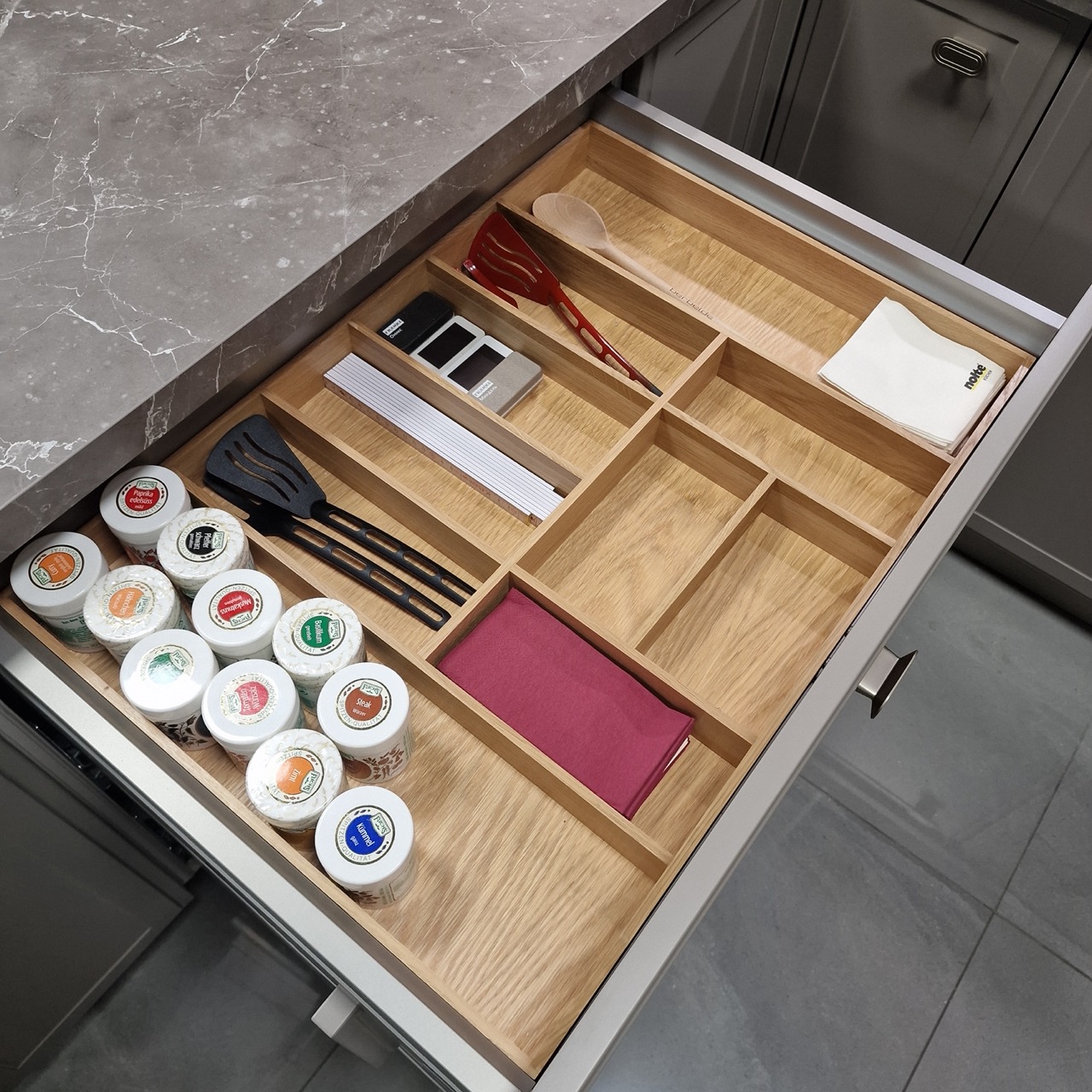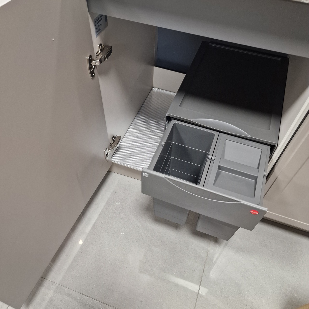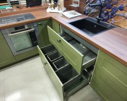 Выдвижные мусорные ведра 600 мм (ящик под мойку), распашной шкаф с двумя полками (3 промежутка) можно сделать из него ящик для посудомойки на 600 мм, выдвижные ящики 900 мм (1 низкий ящик, 2 высоких), пластиковый вкладыш для столовых приборов.