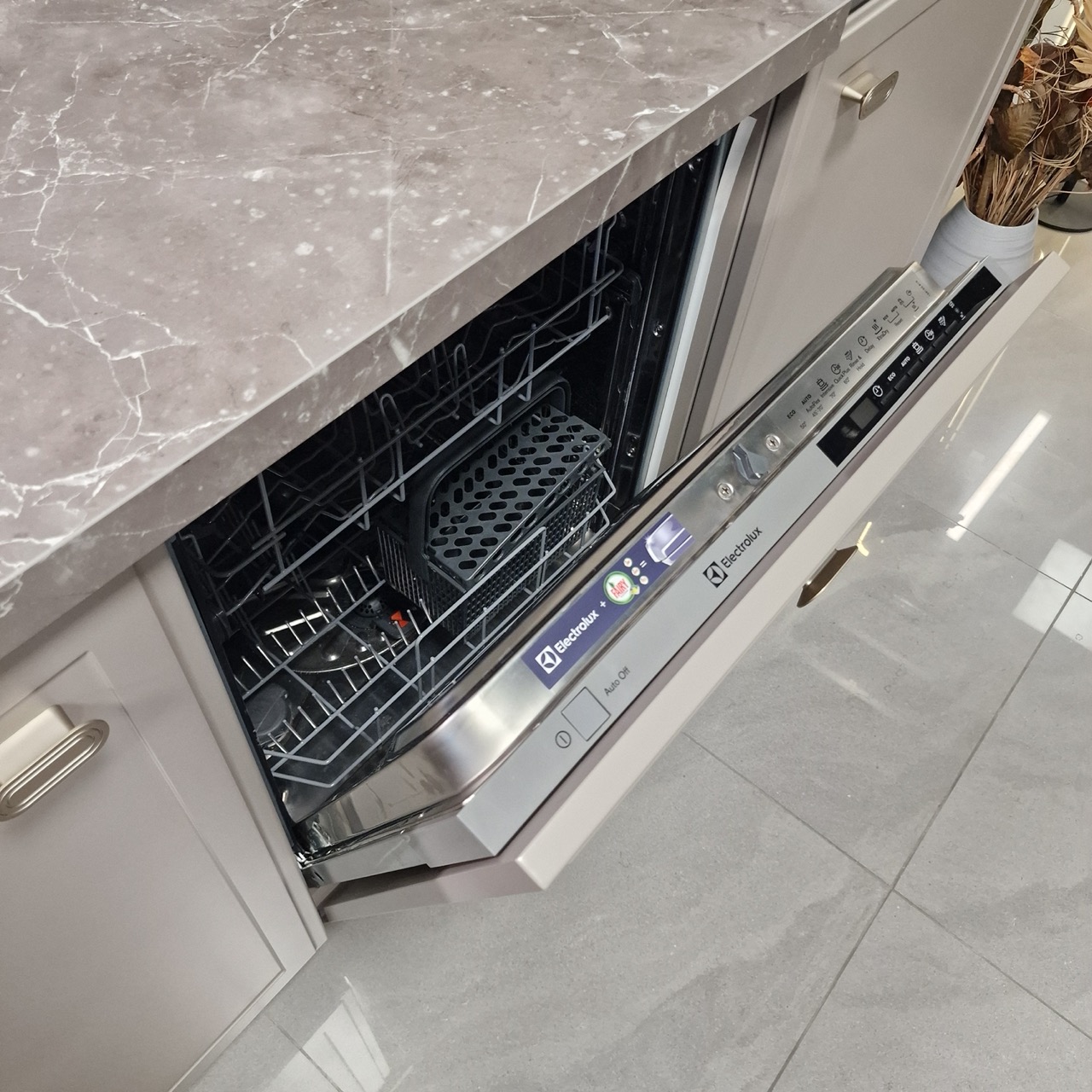 Карго 300 мм, деревянный вкладыш для столовых приборов, углубленная столешница со стороны варочной 750 мм, угловая поворотная корзина, выдвижные мусорные ведра, подсветка в верхних шкаф, фасад для встроенной посудомойки на 600 мм.